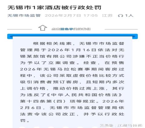 無錫市市場監(jiān)督管理局在1月16日對蠡湖之星旅館有限公司涉嫌在今年錫馬期間存在的賓館酒店價格不正當(dāng)行為進(jìn)行立案調(diào)查。